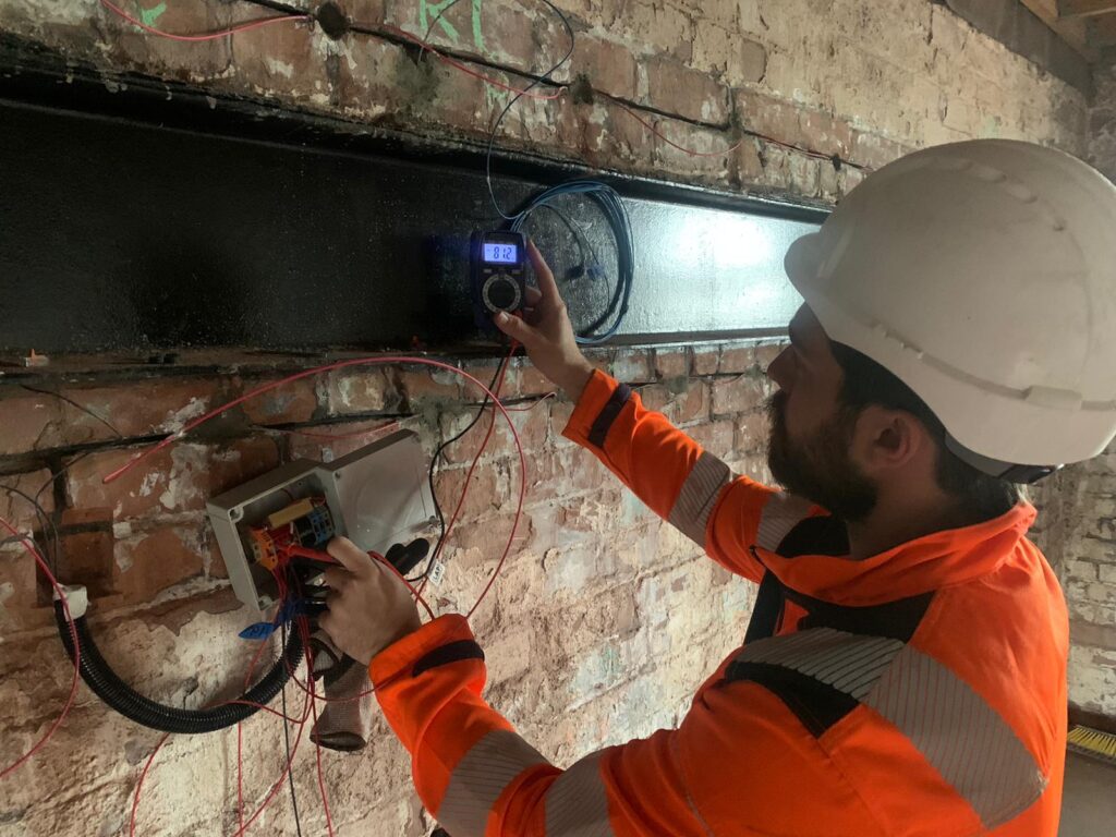Ensuring electrical continuity required filling the voids within the brickwork. Hydrated lime mortar was chosen for its compatibility within historic masonry. Using a Mobile Elevating Work Platform (MEWP), core holes were drilled approximately 20 metres up the structure, and lime mortar was pumped in via a grouting pump, carefully filling the voids and enabling current to flow fully around the I-beams. Half-cell measurements were taken on site to confirm that electrical continuity had been restored effectively.
